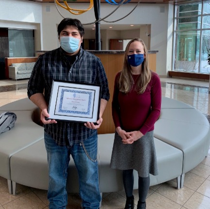 On 2/18/2021, Mario was formally presented the Individual Achievement Award. Suzanne Markin who is the Youth Program Manager of Kane County Office of Community Reinvestment was there to present the award to Mario and his dad (Angelo). Winners of this award are chosen by the local workforce innovations board. The award goes to a customer who is looking for employment and who has received assistance from WIOA and another core partner (PAEP) to accomplish new career goals. Mario works part time at Delnor Hospital in the kitchen, and he has been an employee there since February 2020. Way to go, Mario!
