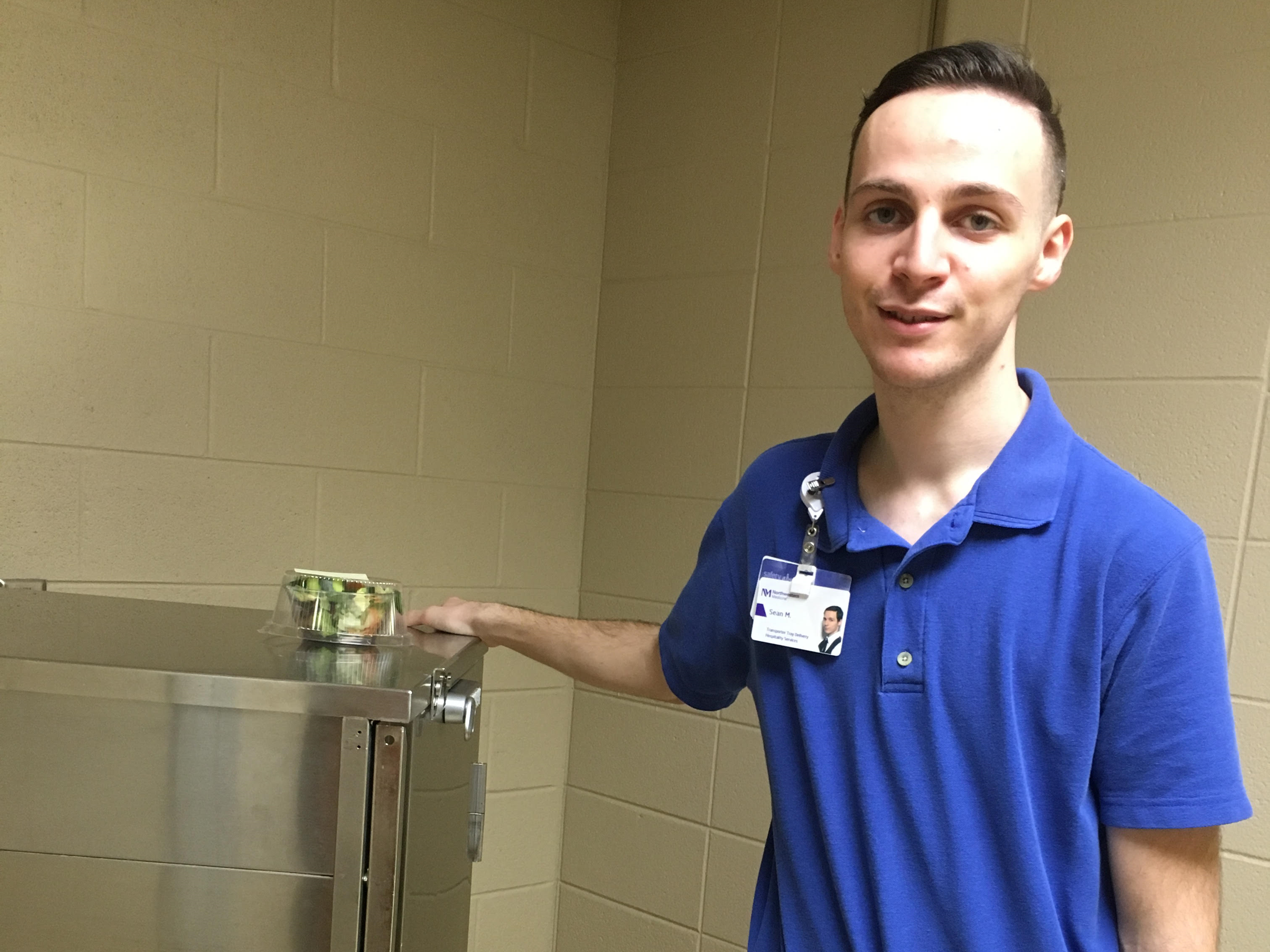 Project SEARCH staff was notified by Vickie Yuskis (Patient Services Care Manager) when a job posting for a transporter meal delivery position was posted. Sean applied right away and was hired on the spot.
